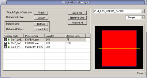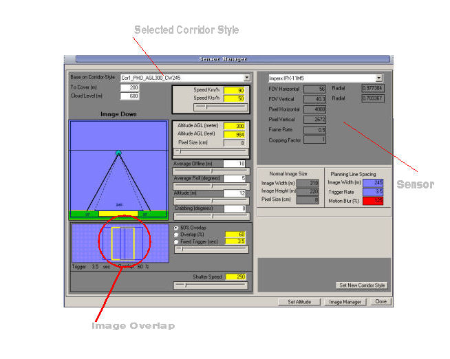 Corridors Styles: One of the example devices in the sensor system is based on the Image sensor Imperx IPX-11M5. This sensor is defined as a free trigger type (Triggertype:3) with a 3 seconds default trigger. A free trigger type means that we can adjust the trigger time during the flight. If we want to achieve an image overlap of 60% at 300 meter 50 kts, the trigger is set to 3.5 seconds. Pixel size will be 8 cm and normal image width 319 meter. Unfortunately flying precise on a virtual line is very hard to maintain, in real life pilots are more offline then on the line. To compensate we use another line spacing. For this corridor style I have calculated offline 10 meters (both sides), variable in height 12 meters and an average roll of 5 degrees using the slide bars. In those three axes the pilot will be working in. The line spacing is now 245 meter wide and more 'save' to build a flight plan. Concern the shutter speed, by moving de slider value we can determine when image blur will appear. If there is no optimal weather condition and the shutter will drop below 250, motion blur is guaranteed. ![]() By pushing the set button we created a corridor style with all our predictable flight and image conditions. Now we can define our survey speed for this specific style. ![]() And maintain all corridor styles in the corridor manager. ![]() |