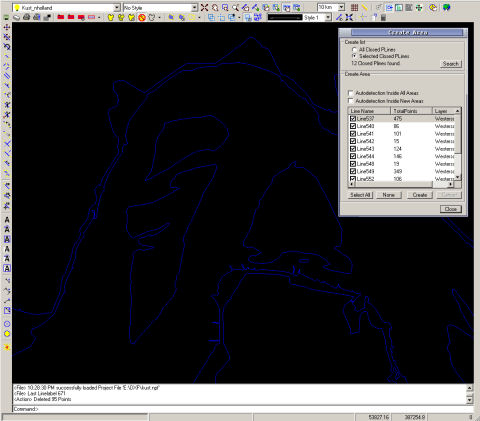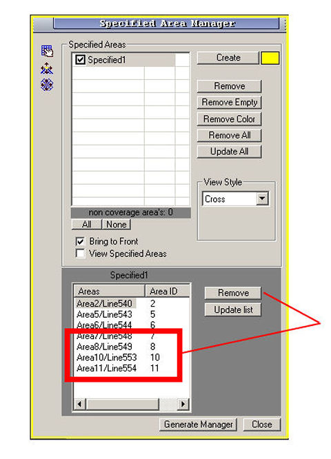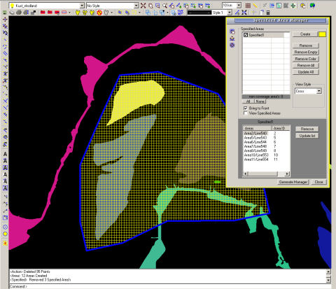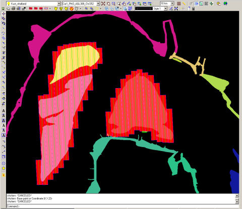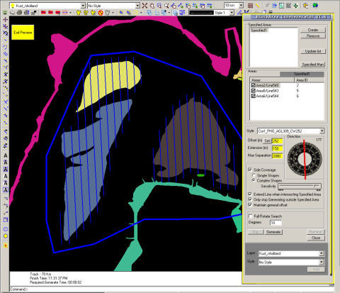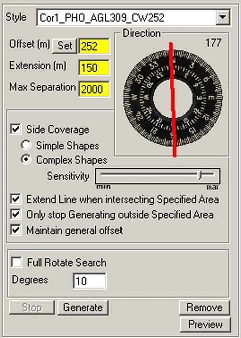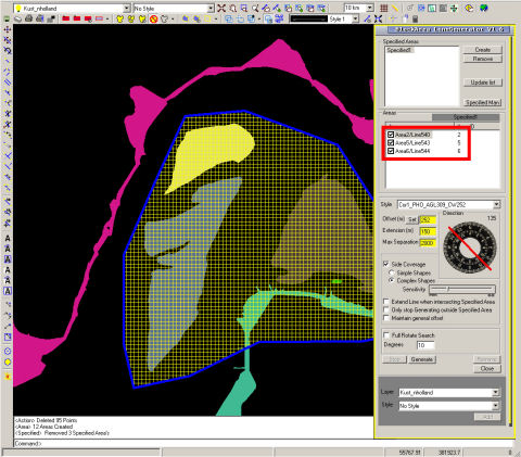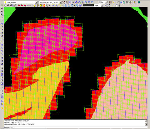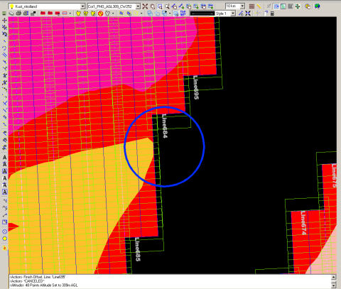 Generate Tool: This generating tool will create parallel flightlines for simple or complex to cover areas. It works in three steps. step1: First we have to create areas, those are necessary to give the tool a working area. We can create areas by selecting closed Plines, open 'create area form', and push button 'create'. ![]() ![]() step2: Next step is to create Specified Areas Open the 'Specified Area Manager' and draw a polygon area around your area of interest. ![]() After drawing a list is created with all areas inside the polygon, in this case we are not interested in the last four areas, so we remove them from the list. ![]() step3: Close the 'Specified area manager' and open the 'Generate manager form', select specified1 and as we can see specified1 contains only three areas (red rectangle). ![]() We already created a corridor style in the 'Sensor manager' named Cor1_PHO_AGL309_CW252. A corridor with main image sensor Imperx IPX-11M5, altitude 309 meter and Line spacing 252 meter. Default parallel offset is set to 252 meter and line extension 150 meter. If 'Full rotate' option is set to true, the generate tool will rotate between 0 and 180 degrees and calculate the best heading, regarding distance and lowest line amount. In this case the heading is fixed to 177 degrees. ![]() ![]() After generating we select a layer to add the attached flightlines. The most work is done, but still there are some areas that need attention. Especially areas where probable data gaps could arise needs an extra parallel line or small adjustment, mostly those are on the edges. Reminding that the most corridors we are working with are 'line spacing corridors'. In the Image manager we can generate uncorrected images to check the risk of data gaps. ![]() Display after using 'Image manager' ![]() In this area we have a potential gap, by extending Line684 we simply eliminate this risk. Apply those adjustments over the whole area and work is done. ![]() top |