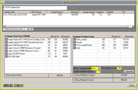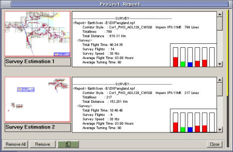 Survey Reports: Together with a prepared behaviour list you can calculate the total flight time, however caution has to be taken, weather conditions, project situation, mechanical problems, fuel problems, unexpected travels, etc, it's always an estimation. Even changing fuel plans will give another daily survey production. Any line selection can be used for calculate the amount of collected field and output data. Several survey circumstances can be calculated and gather together in the 'project report form' for later analyze. Survey behaviour is a build in list that can be turned off or checked individual. Survey and data reports can be exported to a word document. Histograms are added to give a simple time efficiency indication. |